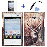 4 items Combo: Mini Stylus Pen + LCD Screen Protector Film + Case Opener + Outdoor Wild Deer Grass Camouflage Design Rubberized Snap on Hard Shell Cover Faceplate Skin Phone Case for Straight Talk LG Optimus Logic L35G/ /Net 10 LG Dynamic L38c